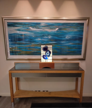 With various colours, agates became a good choice for my first series of agate lamps. I explored the use of them with inspired designs echoing the art of 'Mondrain'. The lamps have an abstract geometric element to them, while the agates themselves give a very organic feel in contrast. This has resulted in producing unique individual pieces of art plus an attractive lighting solution as well.
